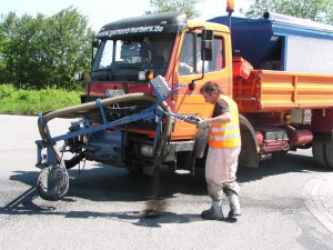 Die gereinigten Schadstellen werden mit polymermodifizierter Bitumenemulsion angespritzt. Durch die Spezialtechnik wird eine gleichmäßige Verteilung des Bindemittels sichergestellt, was zu einer optimalen Verbindung des nachträglich aufzubringendem Splittgemisches mit dem Untergrund führt.
